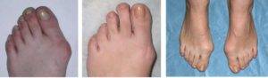 - Деформация стопы. Наиболее часто повреждается сустав на большом пальце ноги, визуально можно увидеть отек, костные разрастания в области проксимальной фаланги.