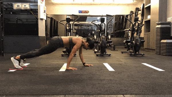 Чтобы выполнить упражнение, используйте диски для скольжения (слайдеры), два полотенца или две одноразовые тарелки. Если вы не сможете найти подобное оборудование, просто сделайте упражнение «альпинист» (№ 5).