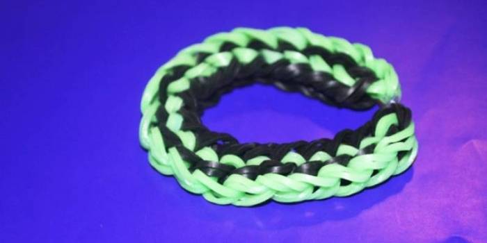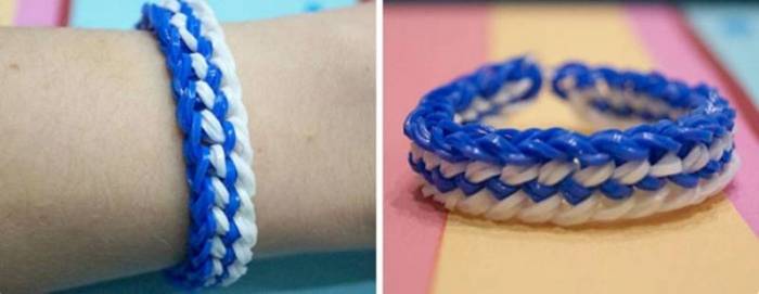 Браслет плетётся на двух рядах станка: среднем и крайнем. Гармонично смотрится браслет, сплетённый их резинок двух контрастных цветов.