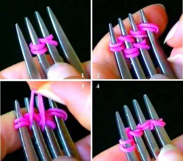 - Аналогично накидывают резинки на 1–2 и 3–4 зубья вилки.