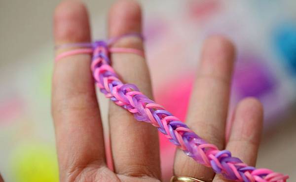 - Накидывается следующая пара колечек, а две нижние резинки снова перемещаются в центр цепочки. Так повторяется до тех пор, пока не будет достигнута нужная длина поделки.