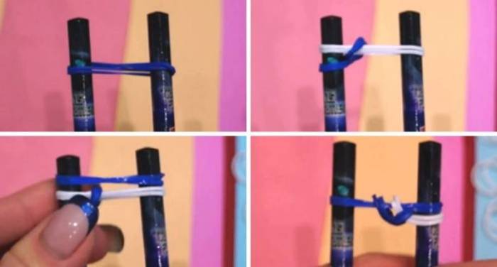 - Возьмите следующую резиночку и пропустите её сквозь петельку на крючке, вторую часть резинки наденьте на крючок, обернув стержень. Протяните первую сквозь вторую.