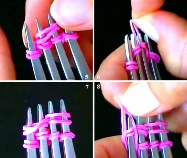 - Следующая пара накидывается без перекрещивания. Две нижние резиночки скидываются в середину будущей цепочки.