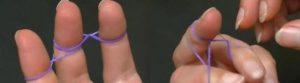 - Снять нижнюю петлю с указательного пальца и оставить её между фалангами. Аналогичные действия провести и нижним колечком на среднем пальце.