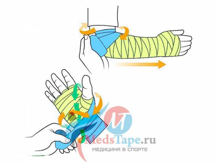 - Полное забинтовывание руки от ладони до локтя обеспечивает наиболее поддержку поврежденному запястью, но на это может уйти больше одного мотка бинта.