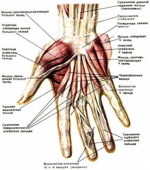 Средняя. Она состоит из мелких червеобразных мышц, располагающихся от глубоких слоев сухожилий до проксимальных фаланг. Функция этих мускулов – сгибание проксимальных фаланг трех средних пальцев, их приведение и разведение в стороны.