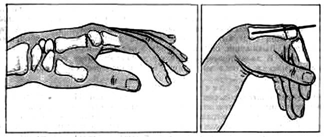 Так же при осмотре врач обращает внимание на возможную ротацию пальцев (поворот вокруг оси). Оценить этот момент можно при сгибании пальцев в кулак. Пальцы должны выстроиться в ряд без разворота и ногти должны быть параллельными.