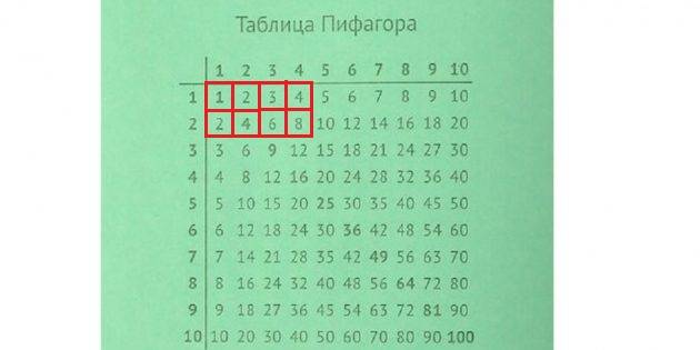 Отсканируйте или распечатайте несколько копий таблицы Пифагора и вместе со школьником рисуйте другие прямоугольники — горизонтальные, вертикальные, маленькие и большие, подсчитывая, сколько в них клеточек. Таким образом вы заодно задействуете зрительную память: вспоминая, сколько будет, например, 3 × 4, ребёнок представит себе соответствующую фигуру — и легко ответит.