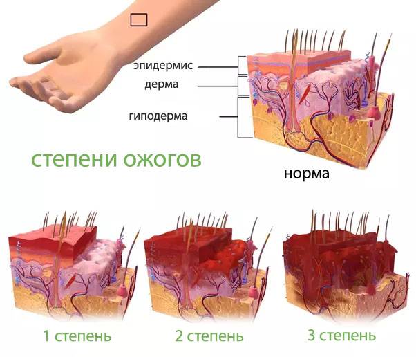 Как лечить и чем мазать ожог зависит от того, на какую глубину повреждены ткани. Все ожоговые повреждения делятся на четыре степени, кроме этого, третья степень делится на А и Б.