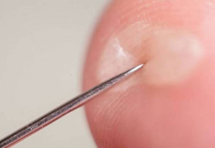 Свежее водянистое новообразование следует осторожно проколоть иглой, которую предварительно следует обработать спиртом. Нельзя прокалывать здоровые участки кожи