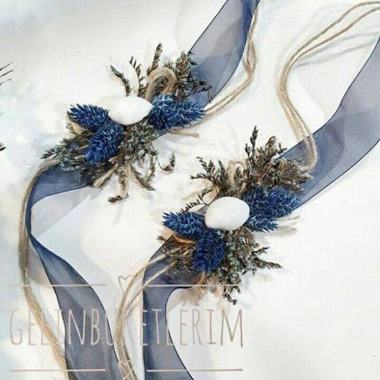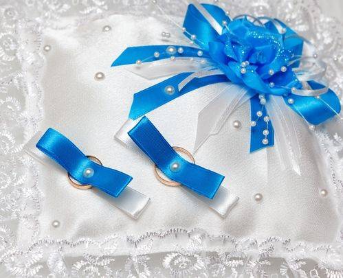 Если в оформлении вашей свадьбы преобладает какой-то один цвет, то лучше, если это отразится в декоре подушечки для колец. Например, здесь ключевой цвет — голубой: