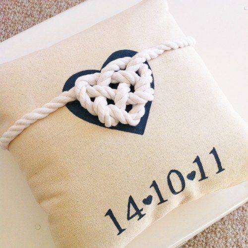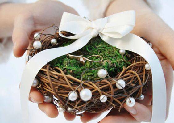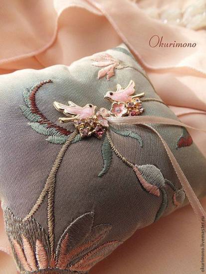 А можно сделать в виде птичьего гнездышка из тонких веточек и украшенного цветами, лентами или жемчугом. Одна из таких подушечек станет прекрасным символом семьи, любви и верности!