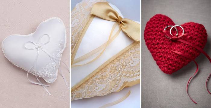 Вариантов изготовления подушечек очень много. Выбор зависит от того вида рукоделия, которым вы владеете. Например, ее можно связать в виде красного сердечка или сшить из шелковой ткани, декорированной нежным кружевом:
