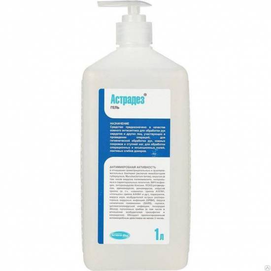 Астрадез. Антисептик для обработки кожи рук на основе ЧАС. В состав входят добавки, смягчающие коду, и косметические компоненты. Отличается широкой сферой применения: средство активно в отношении патогенной флоры, в т. ч. туберкулезной, синегнойной палочки, вирусов гриппа, гепатитов, грибковых организмов. Выпускается в жидкой форме во флаконах с дозатором – 65 и 250 мл.