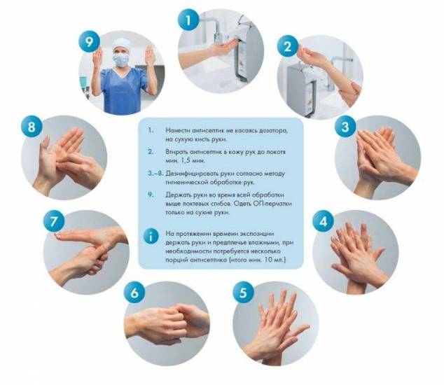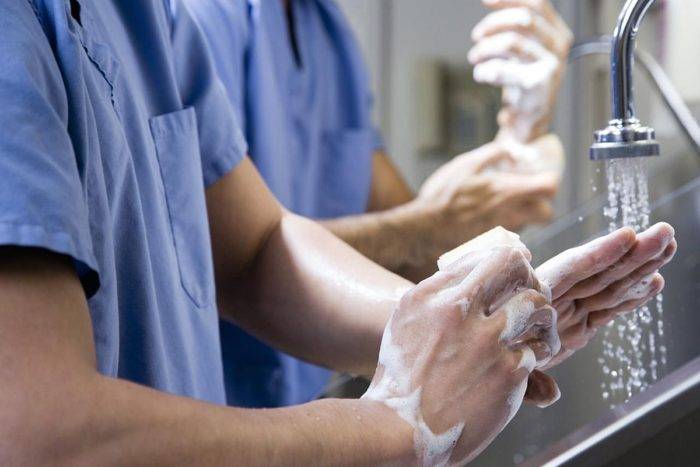 - Обработка рук, локтевых суставов и предплечий антисептическим средством. Процедура необходимо для полноценного обеззараживания тела от возможных паразитов. Процедура повторяется до и после контакта с пациентом или проведения хирургической операции.
