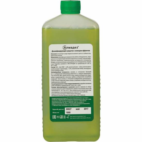Алмадез. Антисептическое средство для кожи рук. Спиртосодержащий раствор в виде спрея. Изготовленный на основе изопропилового спирта – 63%, антисептик обладает высокой бактерицидной активностью. Эффективен в отношении вирусов различной этиологии, грамположительных и грамотрицательных бактерий, грибов и дерматофитов. Выпускается в емкостях 50, 100, 250, 750 мл, 1 л.