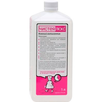 Чистея Люкс. Спиртосодержащее дезинфицирующее средство для рук в жидкой форме с дозатором для обработки кожи рук. Флакон -100 мл. Обладает широким спектром бактерицидного и высокой эффективностью действия. В составе нет красителей и парфюмированных добавок, что минимизирует риск аллергических реакций. Легко втирается в кожу, быстро впитывается, для обработки достаточно 3 мл антисептика.
