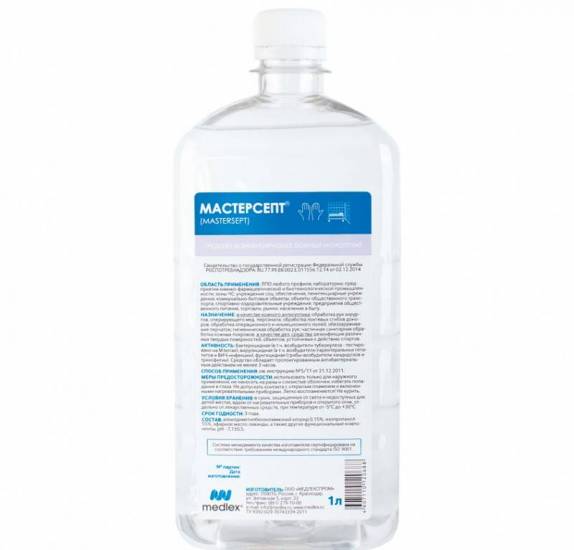 Мастерсепт. Дезинфицирующее спиртовое средство для гигиенической обработки кожи рук, хирургического, инъекционного поля на основе ЧАС. Оказывает широкий спектр бактерицидного и противовирусного действия, разрушает патогенные бактерии и грибы. Сохраняет длительное действие – до 3-х часов. Выпускается во флаконах объемом от 100 мл до 1 л.
