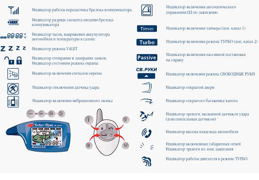 Основной брелок из фирменного комплекта Шерхан 6 наделен дисплеем, а также звуковым сигнализатором. Все вместе это позволяет поддерживать обратную связь – сигналка Scher Khan Magicar 6 является двусторонней. Назначение клавиш брелока рассмотрено в таблице, а на рисунке, приведенном ниже, указаны иконки с подписями:
