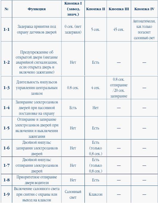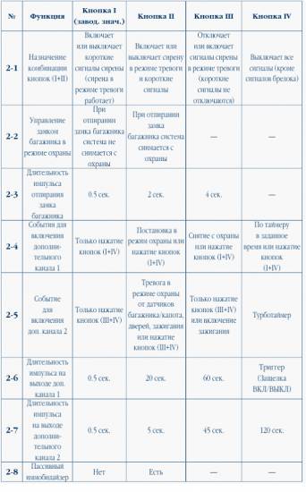 Функция «3» из таблицы «1» отвечает за важный параметр, и ошибочная его установка приводит к выходу из строя ЦЗ. Указанное свойство характерно не только для систем Шерхан 6, но и для любых автомобильных сигналок. В «таблице 2», приведенной ниже, собраны все сервисные функции, в том числе те, которые отвечают за поведение управляющих выходов: