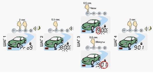- Режим настройки часов включается автоматически, водитель корректирует значение часов и минут короткими воздействиями на клавиши 1 или 2.