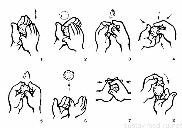 - «Щипки». Процедура похожа на предыдущую. Мячик сжимается между большим и любым другим пальцем, и в удерживается таким образом до 1 минуты. Сжатие повторяется 10—15 раз.