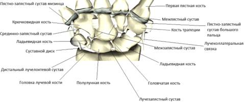 К костям запястья относятся 8 коротких губчатых костей, расположенных в два ряда. Проксимальный ряд образуют (в направлении от большого пальца к мизинцу): ладьевидная кость (os scaphoideum), полулунная кость (os иnatum), трехгранная кость (os triquetrum) и гороховидная кость (os pisiforme), дистальный ряд — кость-трапеция (os trapezium), трапециевидная кость (os trapezoideum), головчатая кость (os capitatum) и крючковидная кость (os hamatum).