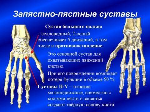 Кости проксимального ряда запястья образуют суставную поверхность для сочленения с запястной суставной поверхностью лучевой кости. Кости дистального ряда имеют суставные поверхности для соединения с пястными костями.