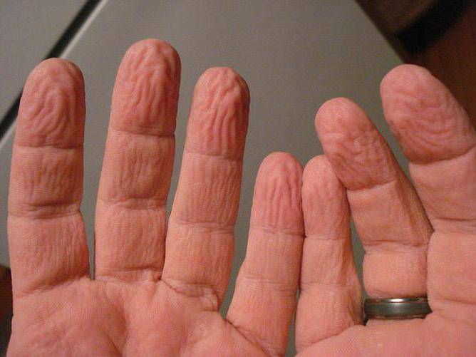 Еще в 1935 году специалисты отметили, что у людей с определенными поражениями нервной системы кожа на пальцах рук и ног после длительного пребывания в воде не сморщивается. Соответственно, причина такого явления может быть неврологической. Ученые считают, что за сморщивание кожи отвечают конкретные нервные окончания, и если их «отключить», данное явление наблюдаться не будет. После такого открытия звучали даже предложения проверять подобным образом работу симпатической нервной системы у тех пациентов, у которых реакция на другие воздействия отсутствовала.