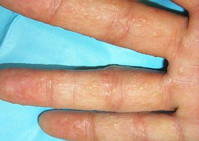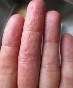 - шелушения и покраснения кожи на пальцах рук и между ними,
