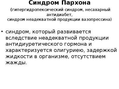 Синдром Пархона — состояние, при котором вырабатывается и выбрасывается большое количество антидиуретического гормона (вазопрессин) в кровь. Вазопрессин — белковый гормон, синтезирующийся в гипоталамусе и транспортируемый в гипофиз мозга. Гормон, доставляясь из гипофиза кровью в почки, заставляет этот орган впитывать большое количество воды с минимальным содержанием натрия.
