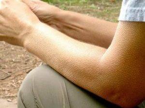 Очень часто озноб, тремор в конечностях, их онемение принимают за гусиную кожу. Это результат недостатка йода в организме и нарушения работы паращитовидной секреции. Игнорировать эти симптом нельзя, обратитесь к эндокринологу, чтобы избежать автоиммунного отторжения клеток желез.