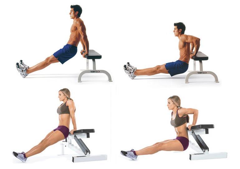 - Обратные отжимания. В этом случае руки располагаются на скамье или другом возвышении, ноги на пятках. Опускайте туловище до прямого угла между локтем и предплечьем. Упражнение в первую очередь развивает трицепс, но также дает нагрузку на плечи.
