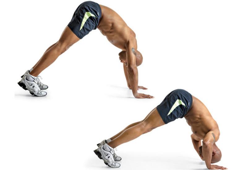 Отжимания уголком. Примите упор лежа и поставьте ноги ближе к рукам так, чтобы ноги и туловище образовывали прямой угол. Стопы при этом стоят на носочках. Из такого полувертикального положения начинайте отжиматься, опускаясь по длинной амплитуде до пола. В упражнении уголком задействованы сразу три пучка дельтовидных мышц и уменьшена нагрузка на руки. Нагрузку меняйте изменением расстояния между носками и ладонями.