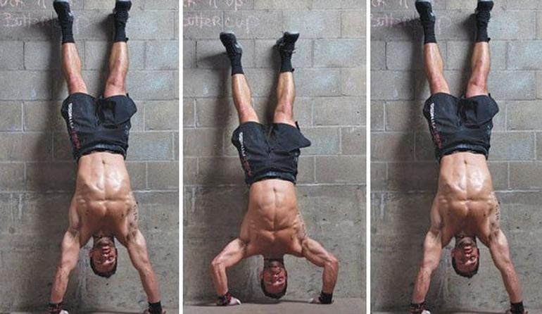 Вертикальный упор лежа. Вы принимаете упор лежа у стенки вверх ногами, ладошки на полу. Начните отжиматься, опуская макушку до земли. Эта разновидность тренировки для опытных спортсменов, требует некоторых акробатических навыков. При этом вы почувствуете, как работают три дельтовидных пучка, будете качать только их. Если хотите научиться этому виду отжимания, попытайтесь для начала постоять у стены на руках.