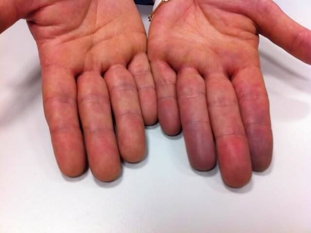 Если онемение вызвано синдромом Рейно, у больного наблюдаются серьезные проблемы с кровообращением. Кроме того, что немеет большой палец, может неметь кисть. Человек постоянно мерзнет в пальцы рук, они у него имеют синюшный оттенок.