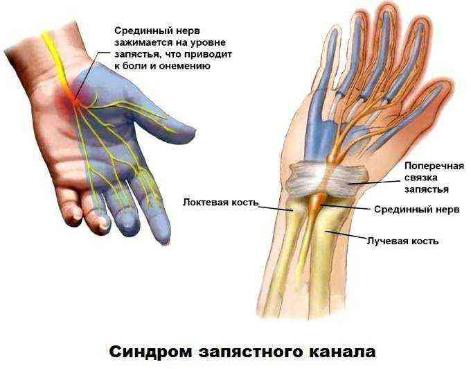 Причиной болезни является защемление и отек нерва, который проходит по карпальному каналу и отвечает за движение пальцев и общую чувствительность.