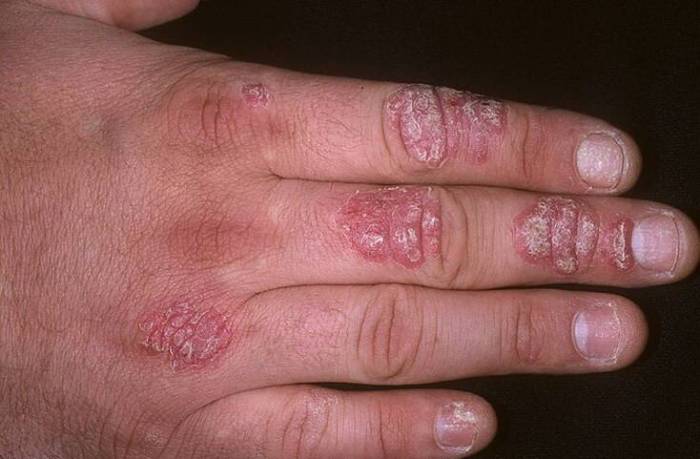 На руках и ногах поражение больше похоже на кружево, которое состоит из круглых пятен, колец и полуколец, сливающихся между собой.