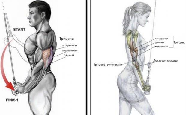 Разгибания на вертикальном блоке активируют все 3 головки трицепса