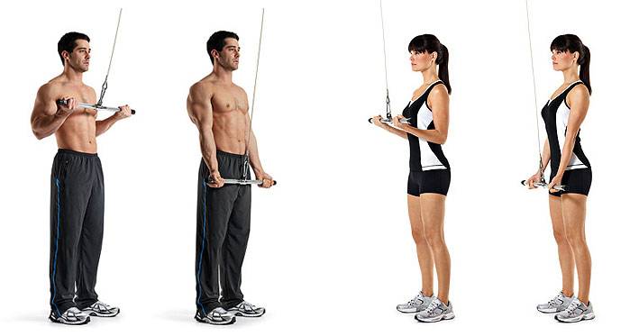 - теперь на вдохе следует максимально напрячь целевые мышцы – трицепсы – и разогнуть руки в локтевых суставах за счет опускания рукоятки блока вниз;