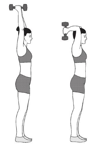 Упражнение “Разгибание рук за головой стоя”. Исходное положение: встаньте прямо, ноги на ширине плеч, колени слегка согнуты, ягодицы напряжены, живот втянут. Возьмите гантели в обе руки, поднимите их вверх и заведите за голову. Руки согнуты за головой, локти прижаты к ушам. На выдохе разогните руки с гантелями, но не до конца, оставляя их чуть согнутыми в локте. На вдохе медленно вернитесь в исходное положение. Выполнять 2–4 подхода по 20 повторений.