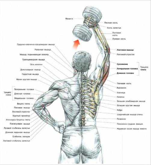 Основную работу в рассматриваемом упражнении выполняет трицепс — плечевая мышца, образованная тремя пучками: длинным, латеральным и медиальным. Она анатомически переходит в сухожилие, прикрепляющееся к локтевому отростку локтевой кости. Задача трёхглавой мышцы — разгибать в локтевом суставе предплечье. Длинная головка трицепса помогает приводить в движение плечевой сустав.