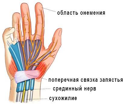При туннельном синдроме происходит ущемление нервных корешков по причине воспаления в близлежащих тканях. Затрагивается срединный нерв запястья, а также нервы в локте.