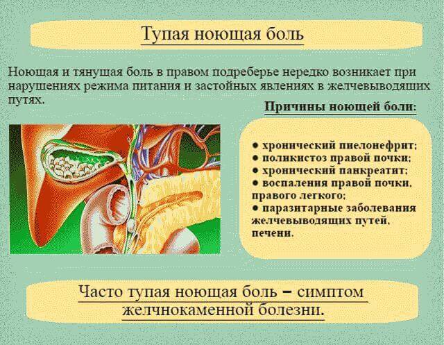 Тупой характер боли относится обычно к хроническому течению. Боли развиваются постепенно и медленно, в ответ на провоцирующий фактор. Если пациент имеет хроническое заболевание органа брюшной полости, то тупые боли будут возникать периодически
