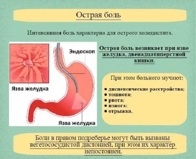 Любая резкая боль указывает на развитие обострения. Вызывать сильную и резкую боль могут состояния наподобие обостренного гастрита или язвы желудка. Главный виновником этих заболеваний считается бактерия Хеликобактер Пилори. Помимо резкой и сильной боли в правом боку возникает метеоризм, ощущение тяжести и распирания, изжога, отрыжка или тошнота. Необходимо принимать соответствующие медикаменты по назначению врача.