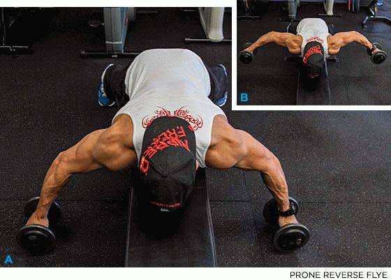 Забудьте про тренажеры. Последние исследования показали, что активность ЭМГ задней дельтовидной и подостной мышцы была выше при выполнение флая в положение лежа с нейтральным положением рук (ладони обращены друг к другу) по сравнению с пронированным хватом (ладони обращены вниз). Несмотря на то что вам скорее всего захочется выполнять данное упражнение на тренажере, все же лучше использовать обычные гантели и скамью. Свободные веса гантели позволят вам не только получить оптимальное положение рук, но и поможет изолировать задние головки дельтовидных мышц и потребует большей стабилизации, чем на тренажерах.