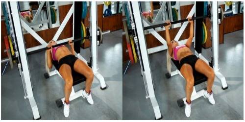 И последнее – жим штанги лежа, узким хватом, и желательно в машине Смита, то есть с поддержкой. Попросите какого-нибудь соратника по тренажерному залу поставить Вам скамью в рамку, и ложитесь на нее под гриф. Держите штангу прямыми руками, и медленно опускаете ее, не разводя руки в стороны, а так, чтобы они следовали по телу. После касания грифом груди – обратно.