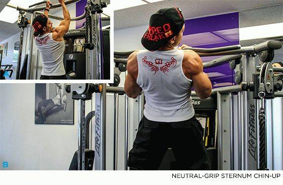 - Начните с нейтрального хвата. Сведите лопатки вместе и подтягивайтесь пока грудь не дотронется до турника.