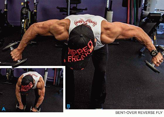 Упражнение в тренажерном зале: Необходимо взять 2 гантели и наклонится в 90 градусов, затем поднять гантели наверх, и постараться зафиксировать их. Не стоит брать большие веса, ведь самое главное это проработать мышцы. При выполнении необходимо держать спину в ровном состоянии. Оптимальное количество повторений 10-13 повторов за подход.