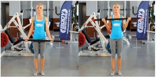 - Жим штанги (стоя или сидя) 20-25 повторений.